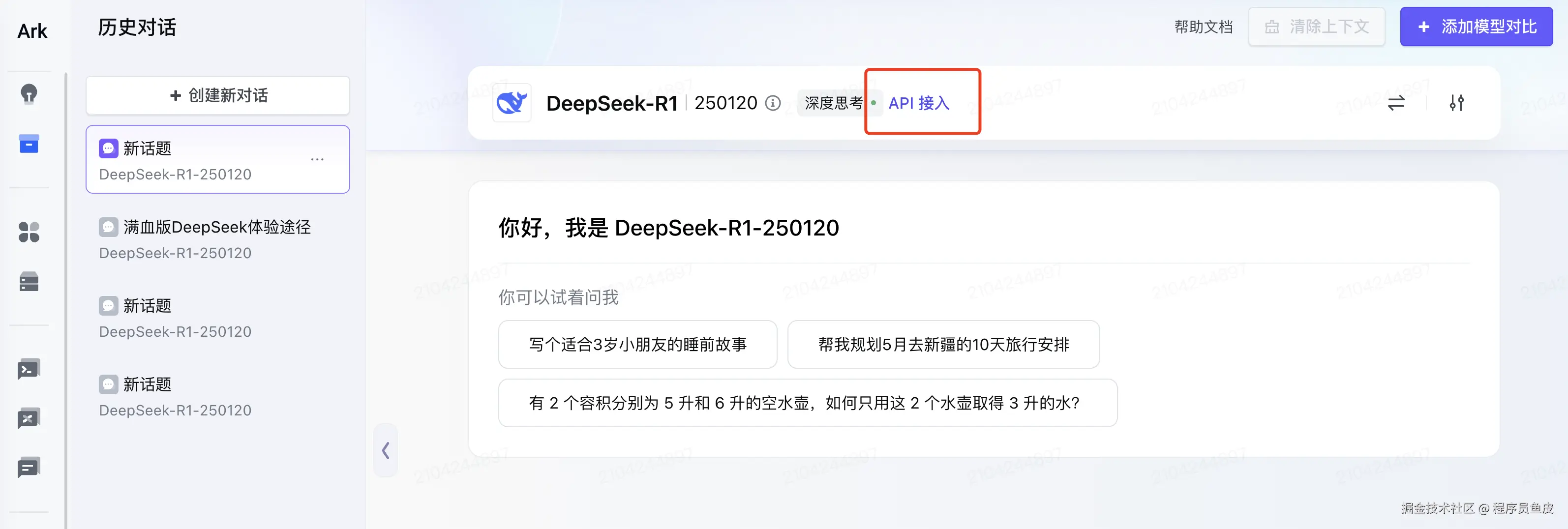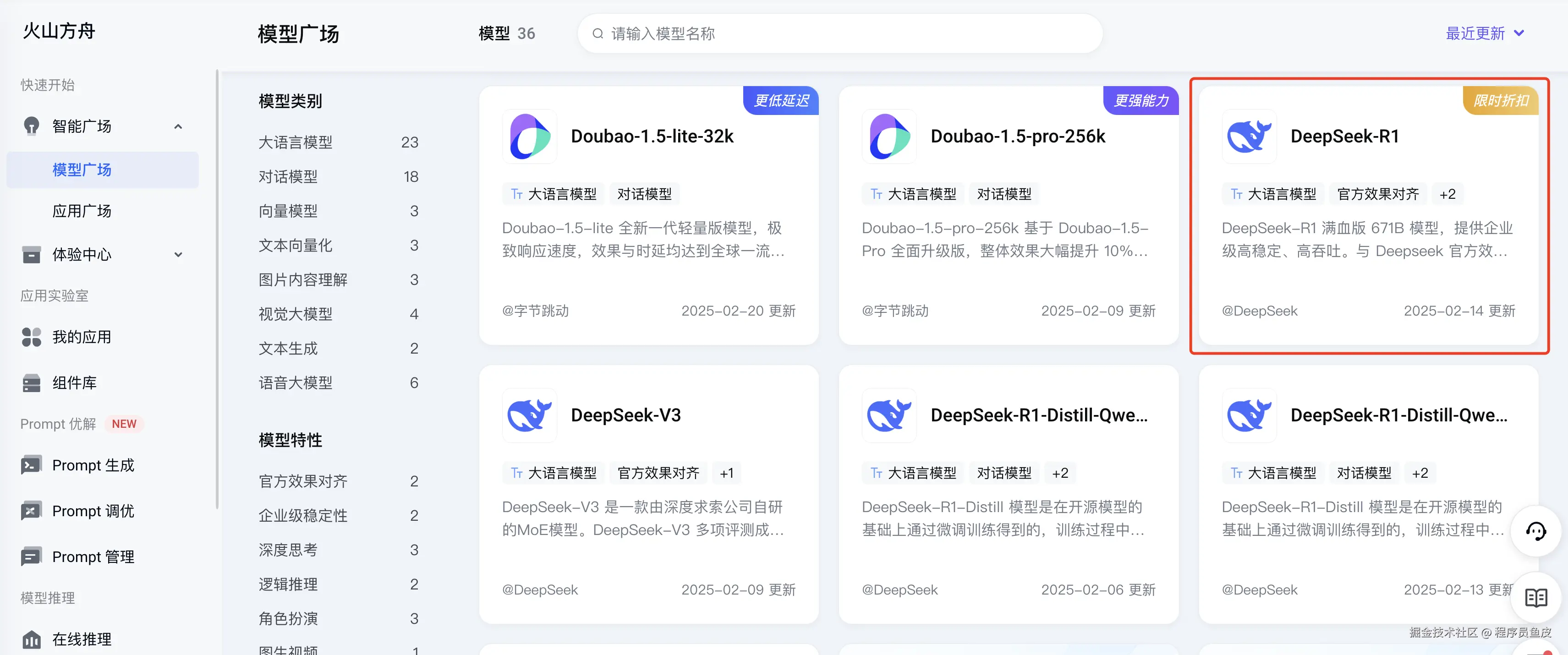 我们再换一个平台 —— 火山,首先进入模型广场,选择满血版的 DeepSeek-R1 模型:
