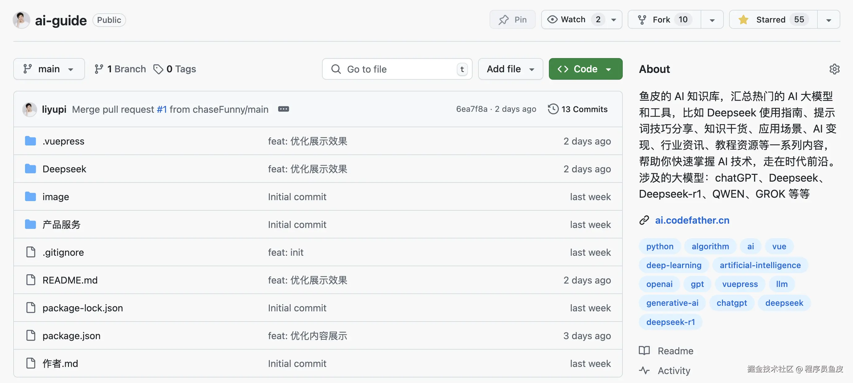 大家如果要学习更多平台的调用、AI 提示词技巧、AI 部署教程、AI 行业资讯、AI 项目,都可以来看看我刚刚开源的 AI 知识库( github.com/liyupi/ai-g… )。大家如果还了解到了其他的满血 DeepSeek 平台,欢迎评论区留言分享~
