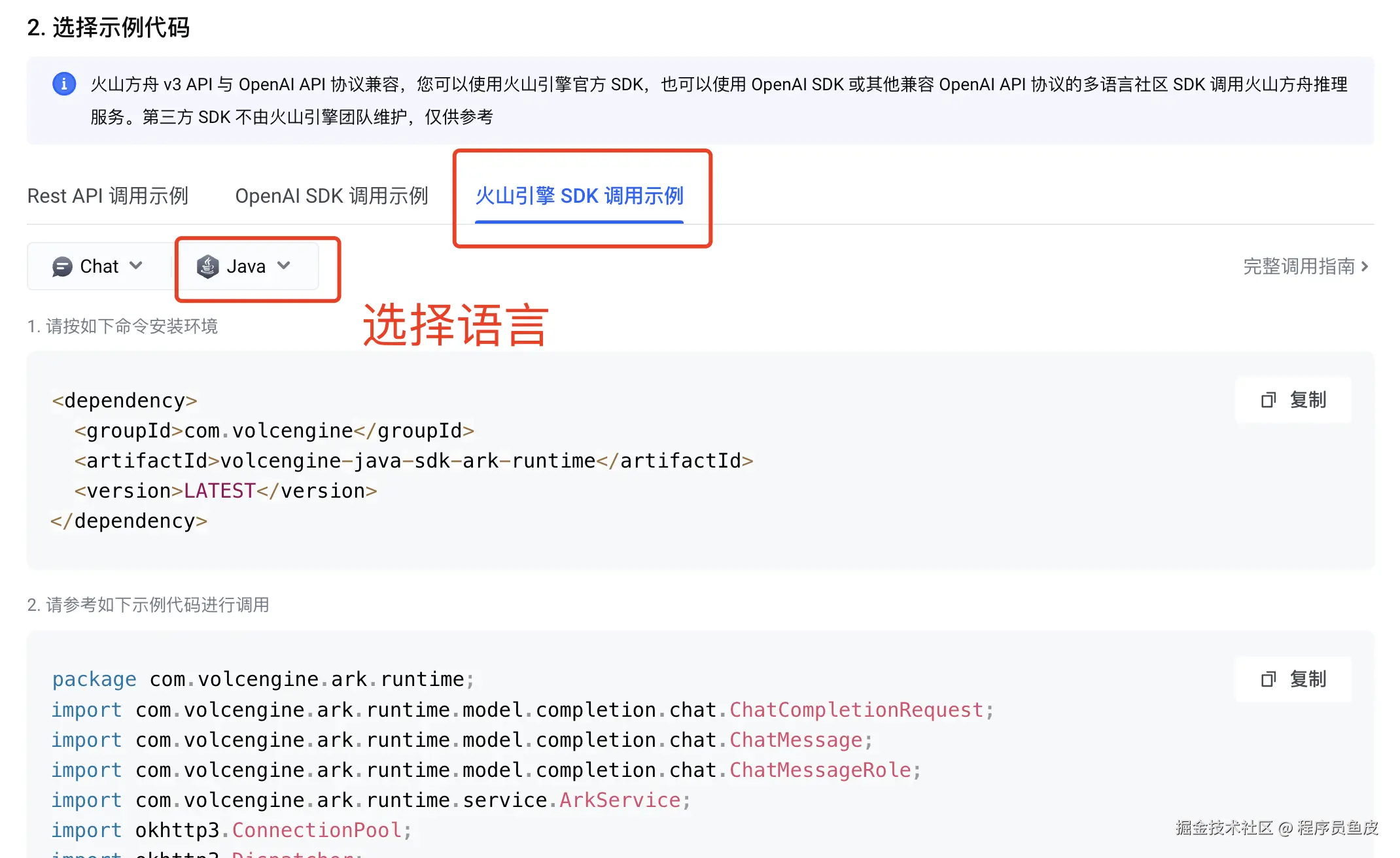 然后我们选择官方的 SDK 调用示例,获取到对应编程语言的示例代码: