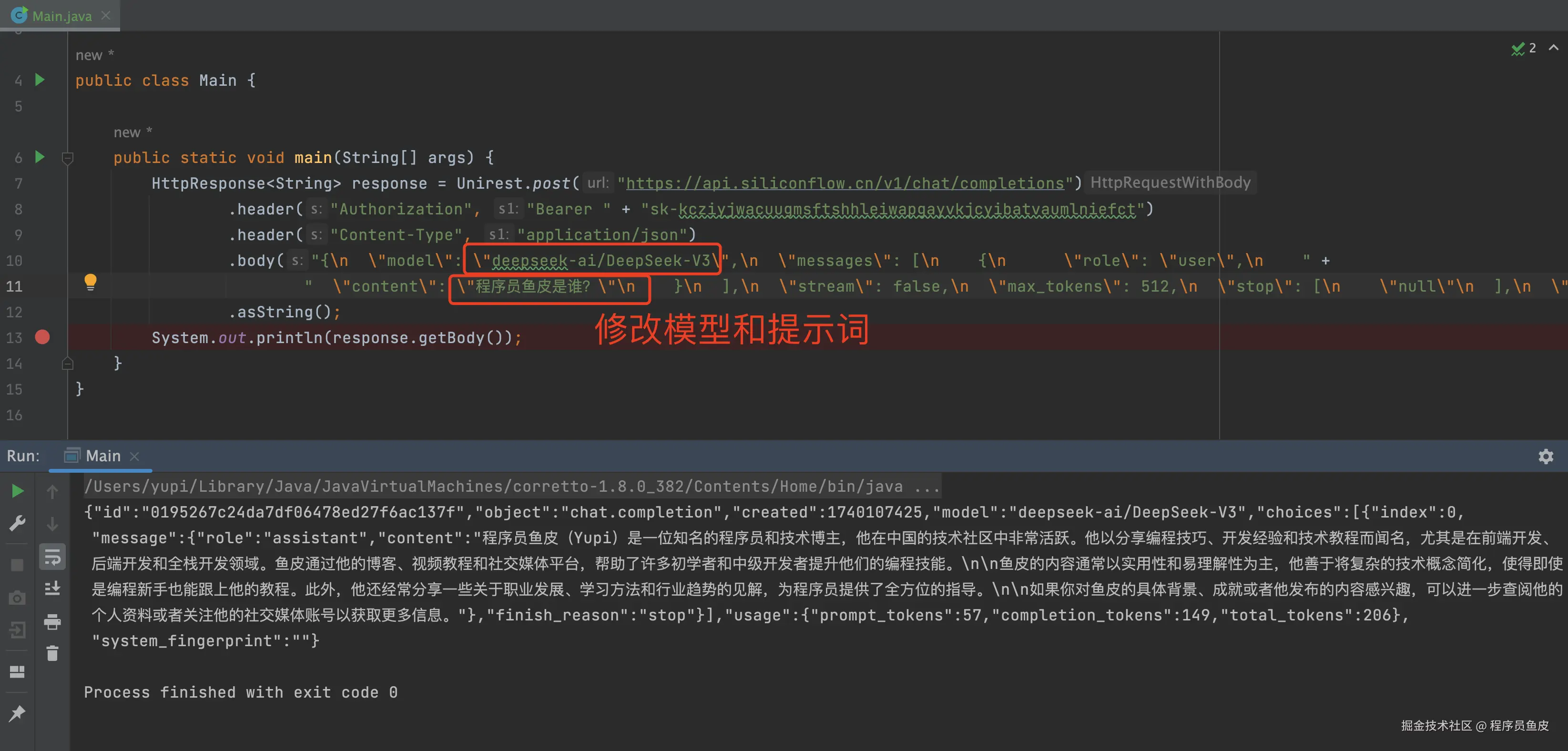 接下来就可以指定想用的模型、要输入给 AI 的提示词,最后打印出 AI 响应的结果即可。就这么几行代码: