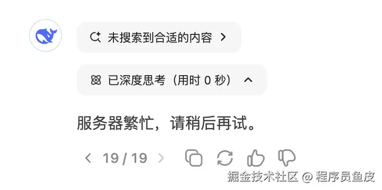 大家好,我是程序员鱼皮。最近 DeepSeek AI 太火了,效果也很强,但致命问题是 不稳定, 经常给我返回 服务器繁忙,请稍后再试,甚至让我怀疑自己被杀熟了。