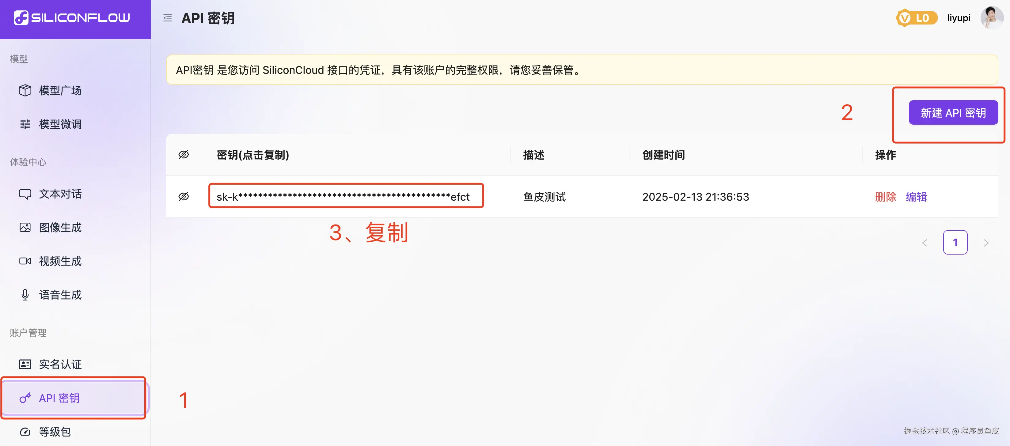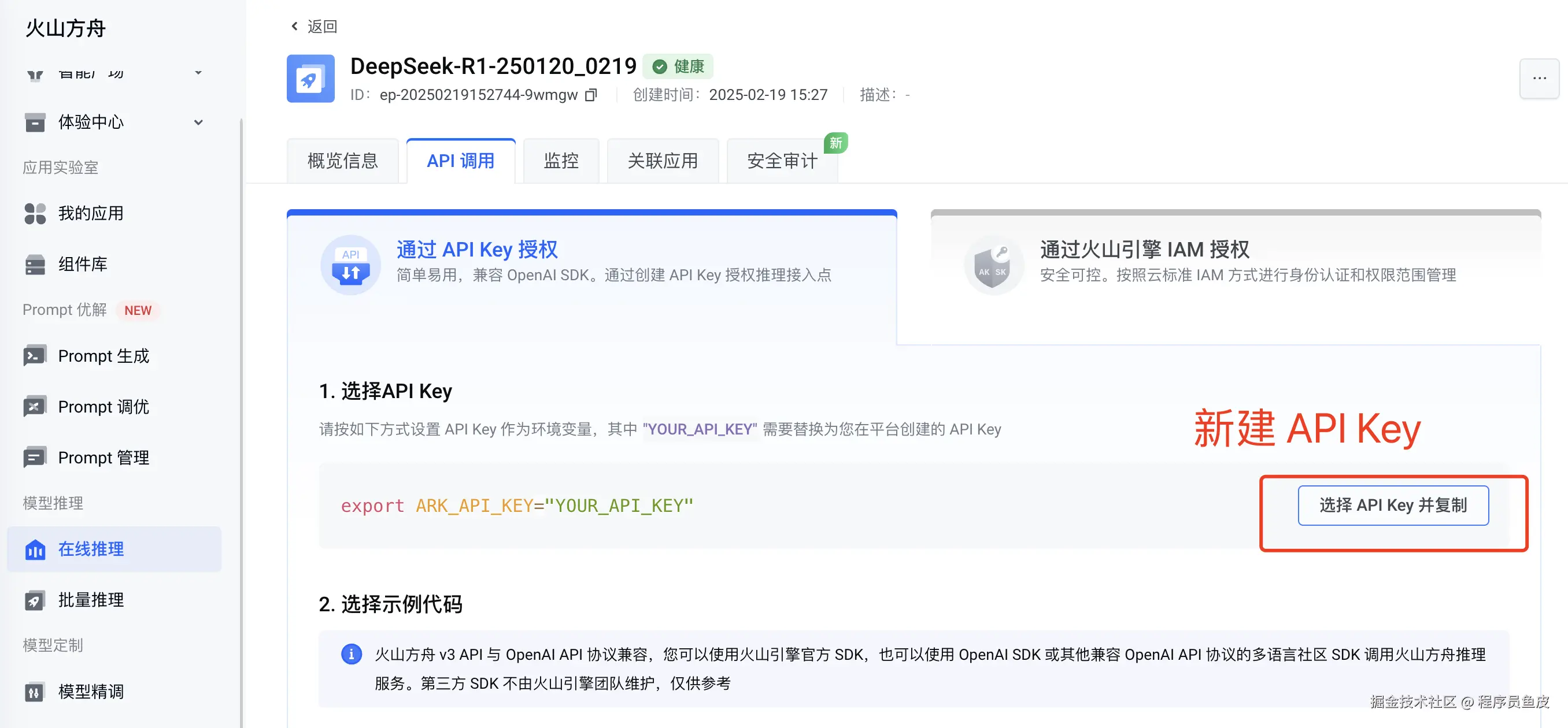 开通成功后,回到之前的页面,确认接入。然后就进入到了 API 调用页面,先创建一个自己的 API Key,保存好等下会用到。