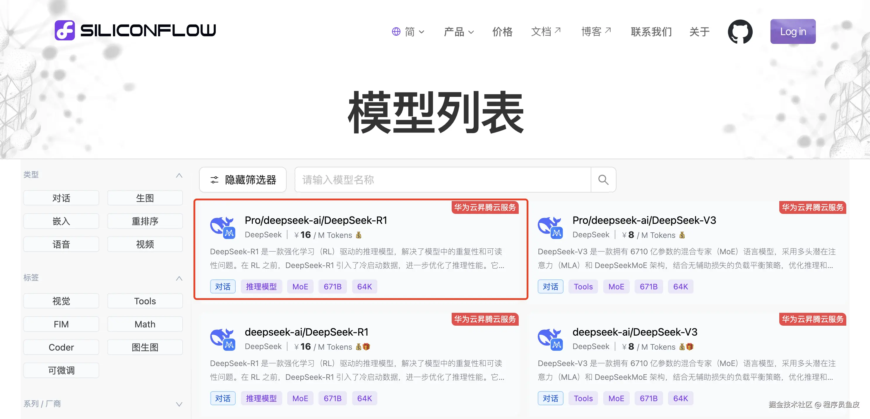 汇集了很多类 AI 大模型的云服务平台。进入模型广场,选择满血版的 DeepSeek-R1 模型: