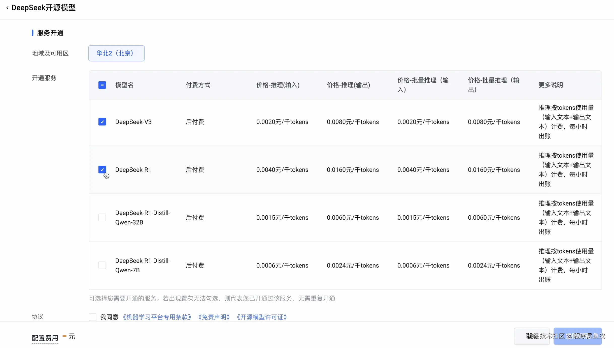 注意,如果还没有开通模型,需要选择 DeepSeek-R1 模型,点击立即开通: