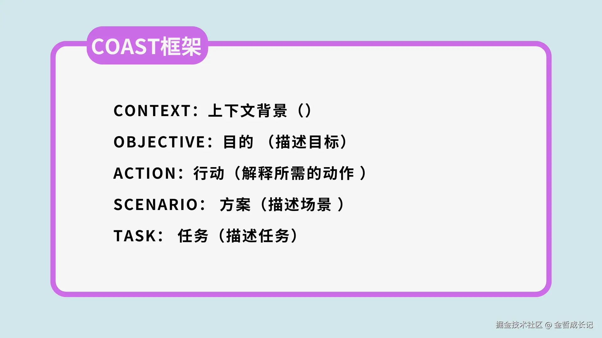 8个框架到这里就介绍完了,当然还有其他结构化提示词框架,比如ERA、CARE、ROSES等框架。