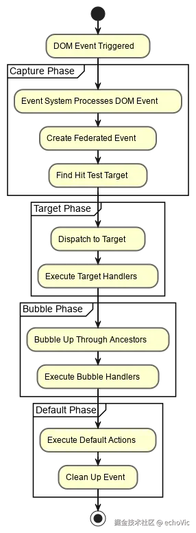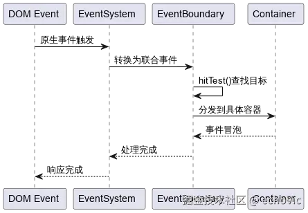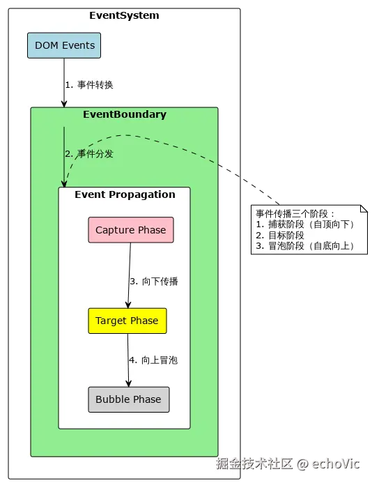 事件系统采用了与 DOM 标准一致的事件传播模型,通过四个清晰的阶段来处理每个事件: