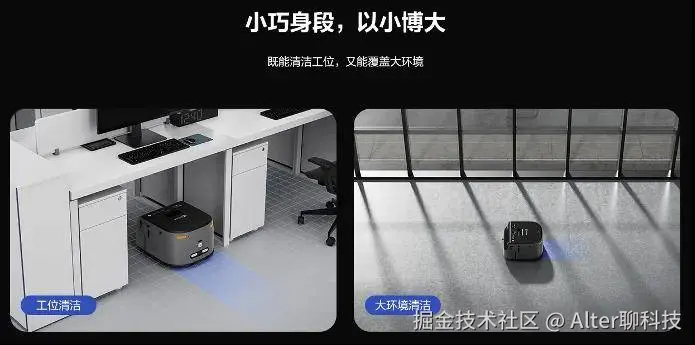 以办公场所为例,人员流动频繁,工位错综复杂,需要精准的定位、路径规划、避障等能力。目前市面上的商用清洁机器人,在需求最大、环境复杂的中小场景里,可能存在绕障不丝滑、体积较大无法清洁低矮区域的情况,而且功能局限在“清洁”这个单一的场景中。