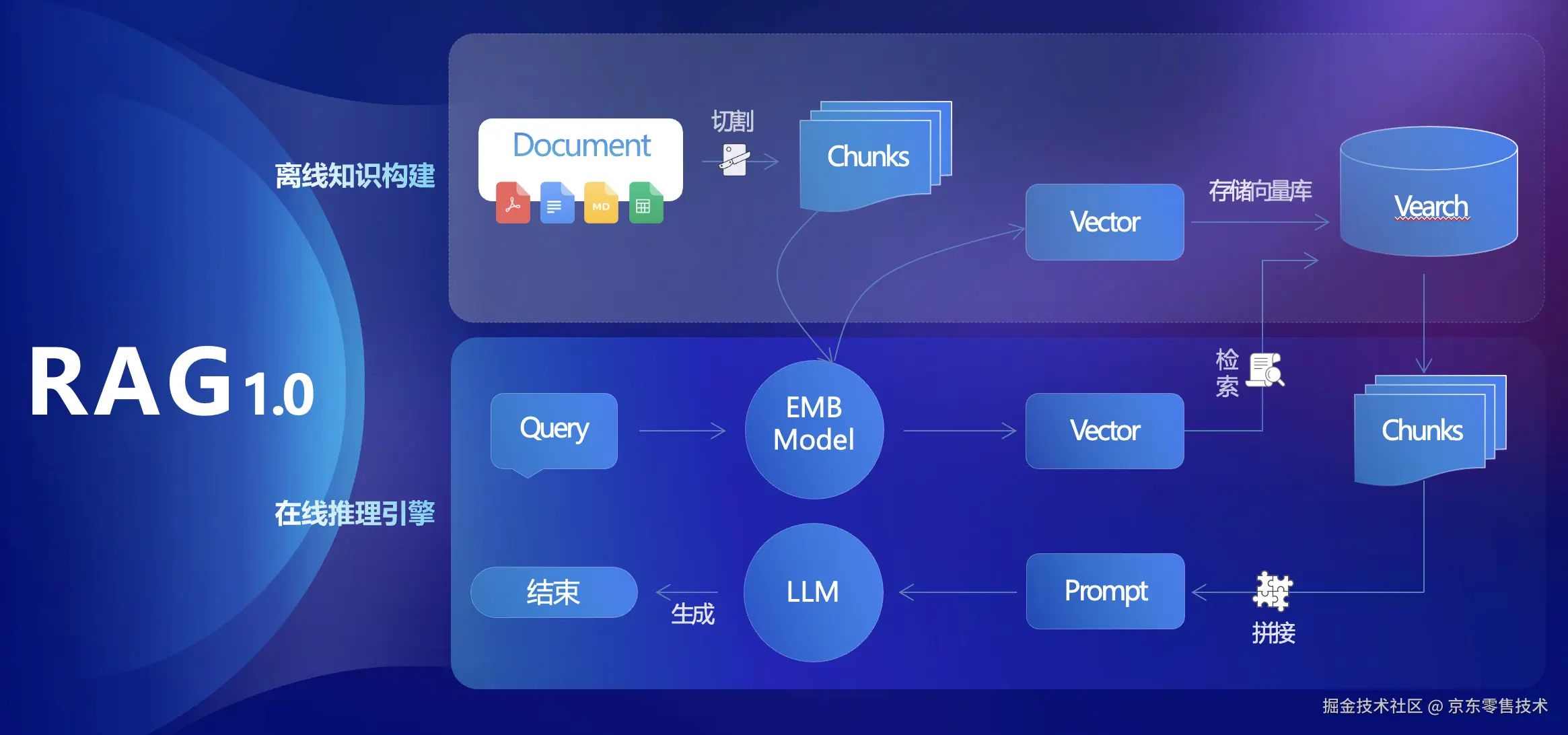 RAG1.0 版本中完成了基础能力的建设,包含两部分:离线知识构建、在线推理引擎。