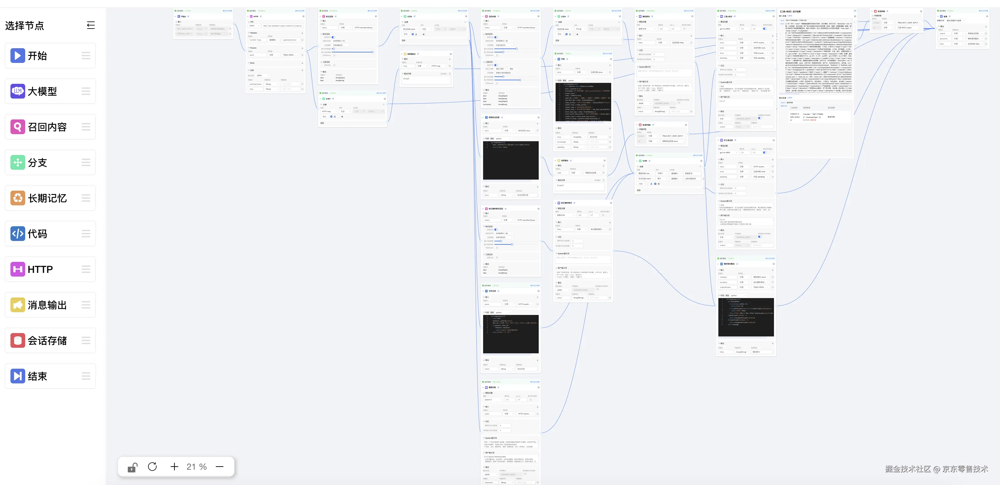 工作流中,可以随意拖拽编排工作流程,比如:召回节点可以设置召回策略、召回数量、最低分值等;大模型节点可以设置 System、User 提示词、历史会话轮数等。