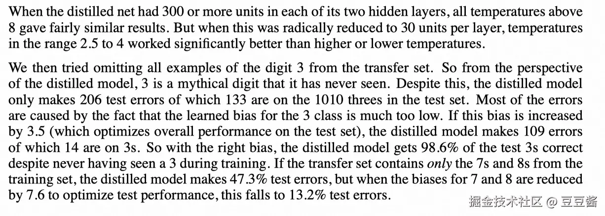 在此基础上,作者将所有手写字为3的样例从 transfer set 中删除,这就表明对于蒸馏后的模型,3是一个它从来没有见过的数字,尽管如此,蒸馏模型只产生了206个测试失败的样例,其中133个是在测试集的1010个3上。大多数错误是由于3类的学习偏差太低而造成的。如果这个偏差增加3.5(这将优化测试集的整体性能),则经过蒸馏的模型将产生109个错误,其中14个是在3上。有了合适的偏差,经过蒸馏的模型在测试3中获得了98.6%的正确率,尽管在训练中从未见过3。如果迁移集只包含训练集的7s和8s,则蒸馏模型的测试误差为47.3%,但当7和8的偏差减少7.6以优化测试性能时,测试误差降至13.2%。
