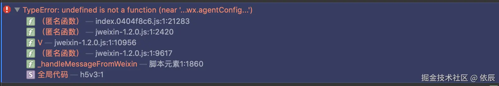 当前这种动态加载JSSDK的方案,可以满足小程序webview与原生页面交互即可以调用:`wx.miniProgram`,但是在企微侧边栏会报错,报错信息如下:`wx.agentconfig is not a function`