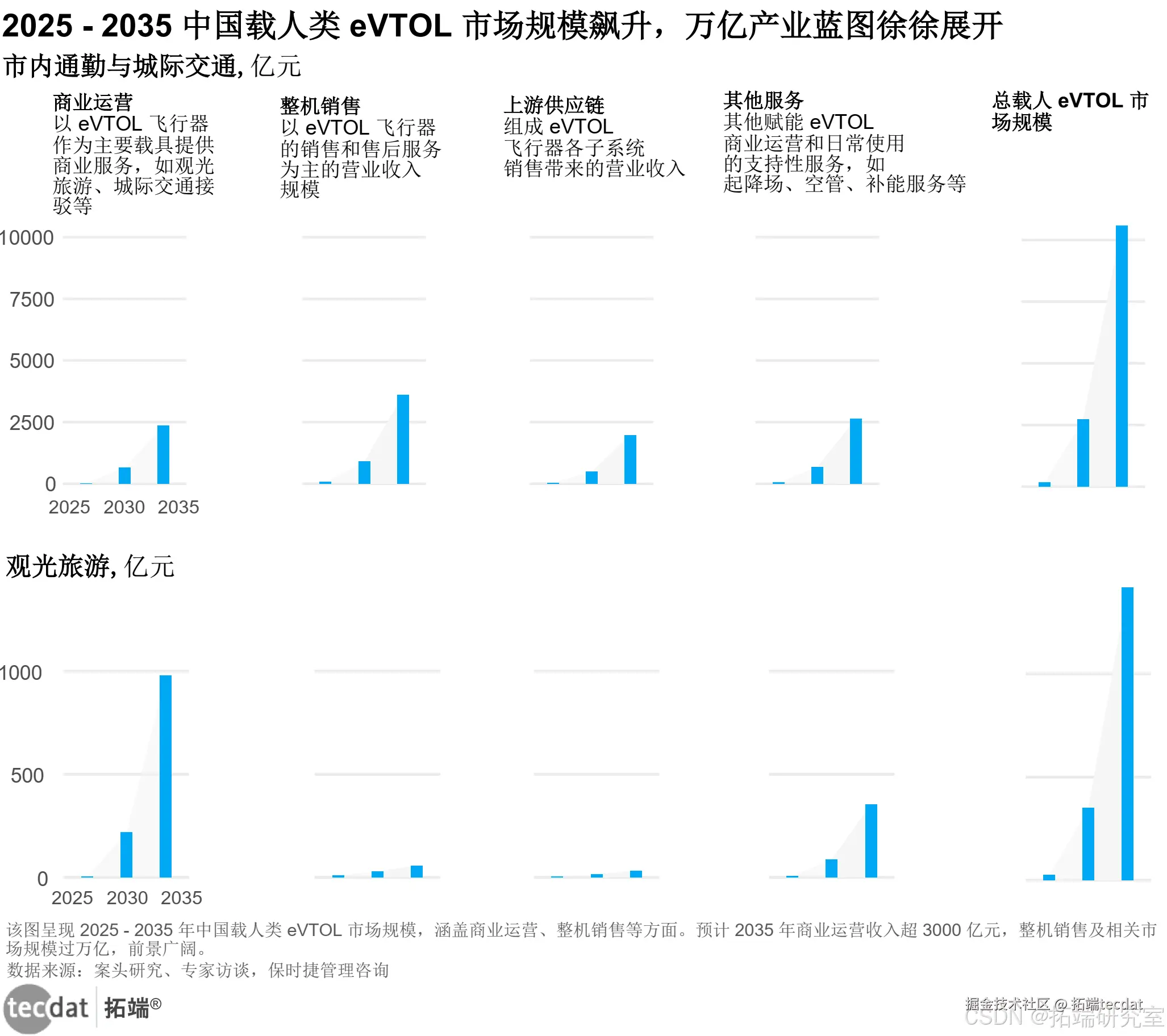 商业化运营收入方面,预计景区观光旅游等场景将率先爆发,随着城内与城际交通的快速发展和配套设施的完善,到2035年商业化运营的营业收入将突破3,000亿元,整机销售及上游供应链市场规模突破6,000亿元,其他支持性相关服务带来市场规模突破3,000亿元,最终形成逾万亿元的庞大市场 。
