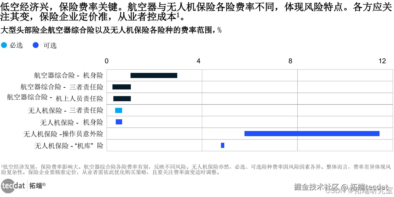 “当前行业需要构建无人驾驶航空器定价模型,匹配更专业化的精准定价。同时,低空经济保险条款与产品矩阵亟待补充,现在无人机保险更多局限于综合险、机身险、三责险的开发,有待进一步补全。”严贤怀表示,不同于传统通航的 To B(面向企业)模式,低空经济保险涉及 To B、To C(面向个人)、To G(面向政府)多模式,保险服务体系也需要转变,从而跟上低空经济的快速发展要求。在低空经济蓬勃发展之际,保险险种费率设定意义重大。