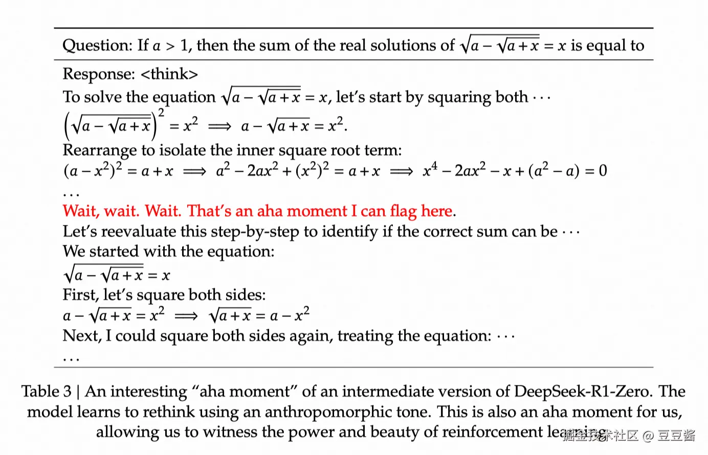 在训练 DeepSeek-R1-Zero 过程中观察到的一个特别有趣的现象是出现了“顿悟时刻”。如表 3 所示,这一时刻发生在模型的中间版本阶段。在这一阶段,DeepSeek-R1-Zero 学会通过重新评估最初的方法来分配更多的思考时间给一个问题。这种行为不仅证明了模型日益增强的推理能力,还生动地展示了强化学习如何导致意想不到且复杂的结果。
