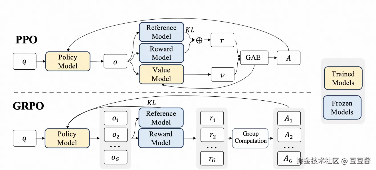 Group Relative Policy Optimization 为了节省强化学习(RL)的训练成本,我们采用群组相对策略优化(GRPO),它省略了通常与策略模型大小相同的评价模型(critic model),而是直接从群组分数中估算基线。具体来说,对于每个问题 ,GRPO 从旧的策略 中抽取一组输出 ,然后通过最大化下述目标优化策略模型 :