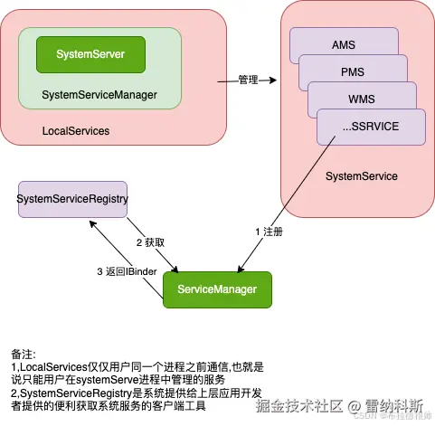 | LocalServices | LocalServices是Android系统中用于在同一进程中注册和获取LocalService的工具类。它维护了一个ArrayMap来存储不同类型的LocalService实例,确保每个类型只对应一个实例。通过addService()方法注册服务,getService()方法获取服务。这些服务不是Binder对象,仅限于同一进程内通信,类似于ServiceManager但更私有化,和ServiceManager最本质的区别是ServiceManager管理的服务都是binder服务,这些服务都是可以在不同进程之间跑的对象 | 管理的是普通的服务,只能在同一个进程之间使用的服务,不具备进程之间通信能力的服务,各个系统service在启动的过程中都会调用LocalServices.addService()把自己的local service注册到LocalServices中,比如AMS,WMS,PMS 注册到LocalServices中的service不是Binder对象,只能在同一个进程中使用,除此之外它的的使用方式和ServiceManager相似。普通的java对象 |