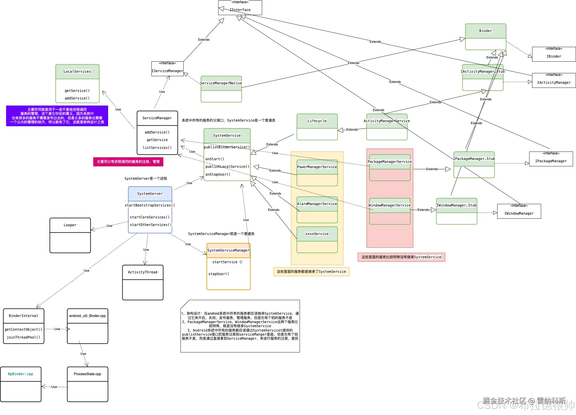 | SystemServiceManager | SystemServiceManager是为了管理SystemServer进程里面运行的90+多个服务(Services)设置的一个管理者角色,这个仅仅用于同一个进程之间使用 | 普通的java对象 |