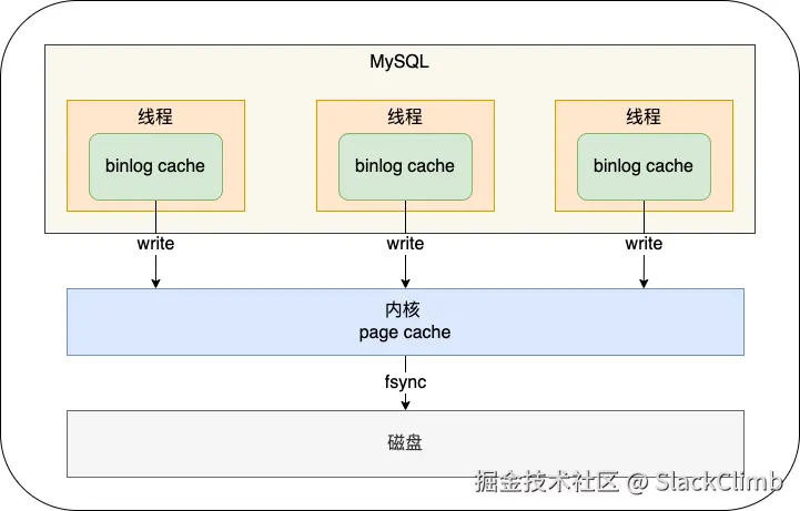 每个线程将缓冲在 Binlog Cache 中的日志文件,最终写到同一个 Binlog 文件。