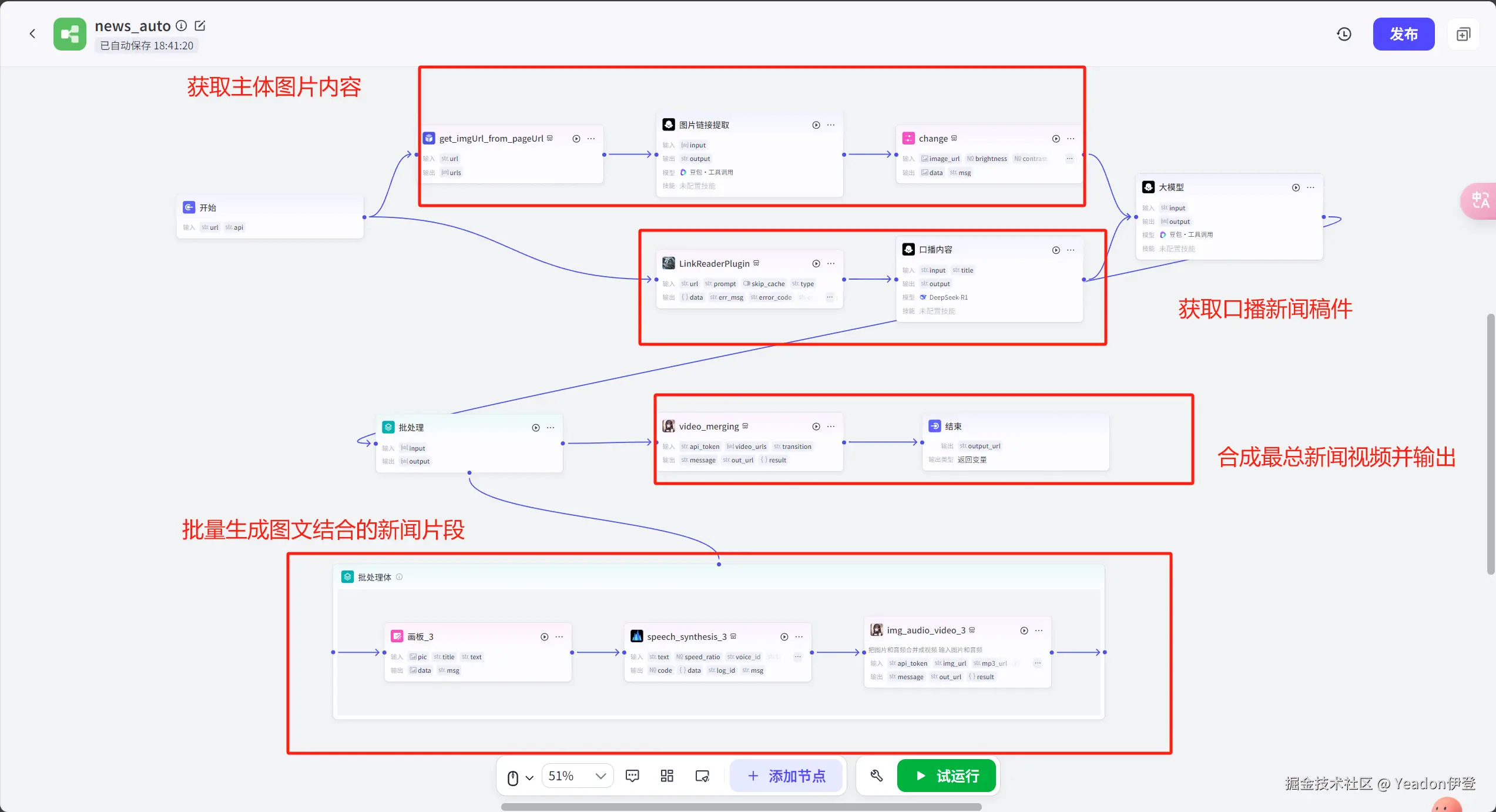 近期观察到 Coze 平台上出现了多种视频自动化视频玩法,**如认知觉醒、英语单词学习**等。本文将介绍如何通过 DeepSeek + Coze 实现新闻播报的自动化生成****工作流,让我们能够仅通过输入新闻链接,即可一键生成图文并茂的短视频新闻。