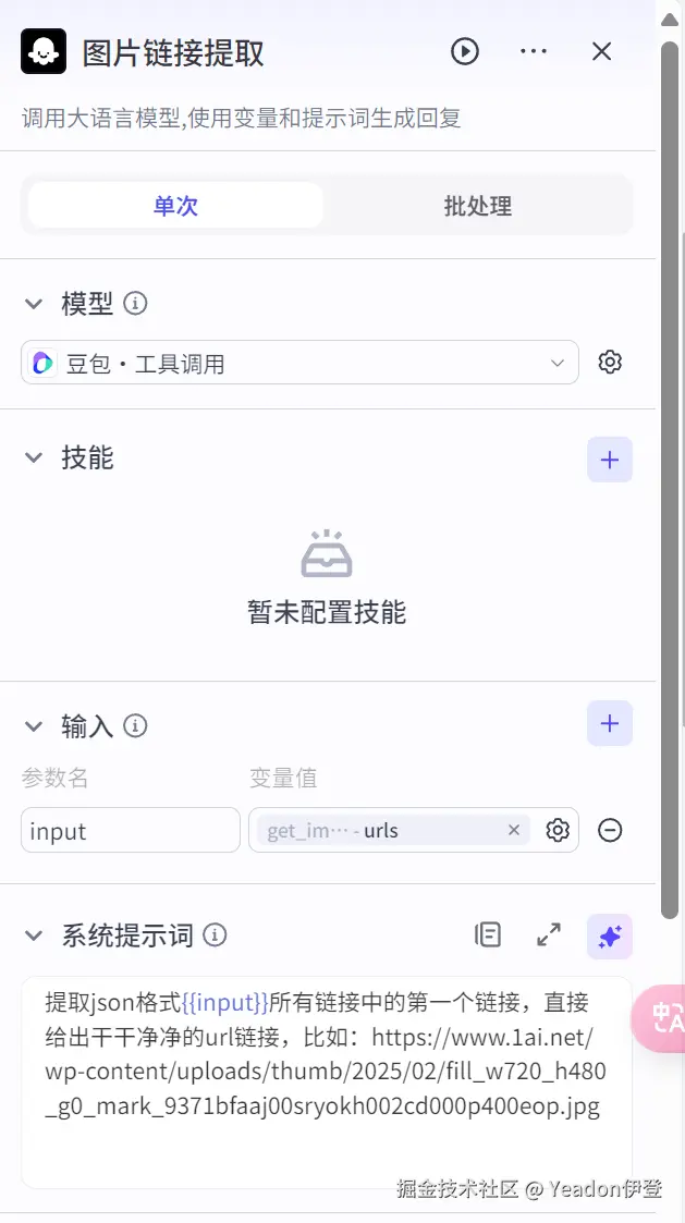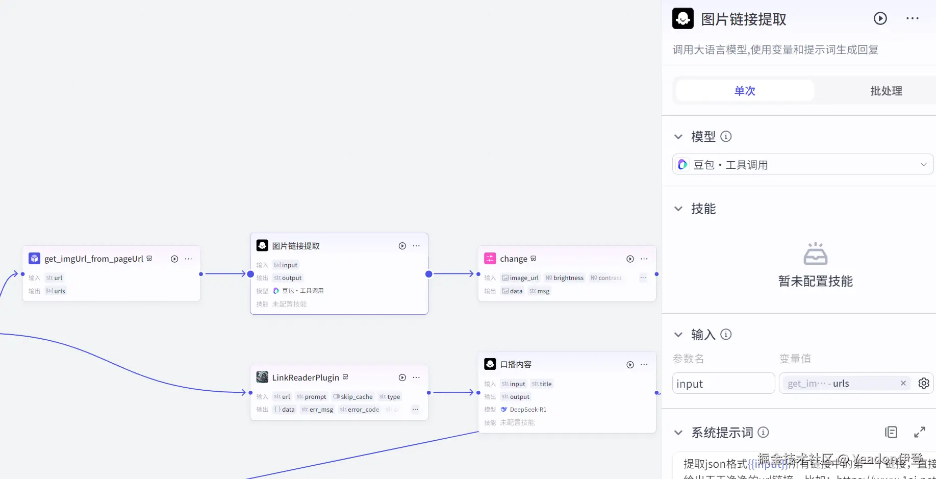 添加图片链接提取节点,如果我们为了**节省写代码时间**,直接用大模型节点帮我们提取