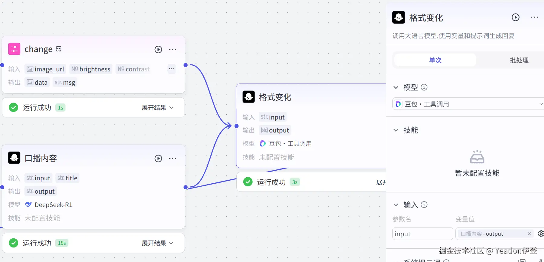 在提取链接后面接上一个大模型节点,用来重写新闻成为口播稿子,这里用到最强的DeepseekR1模型,来生成有吸引力的口播内容