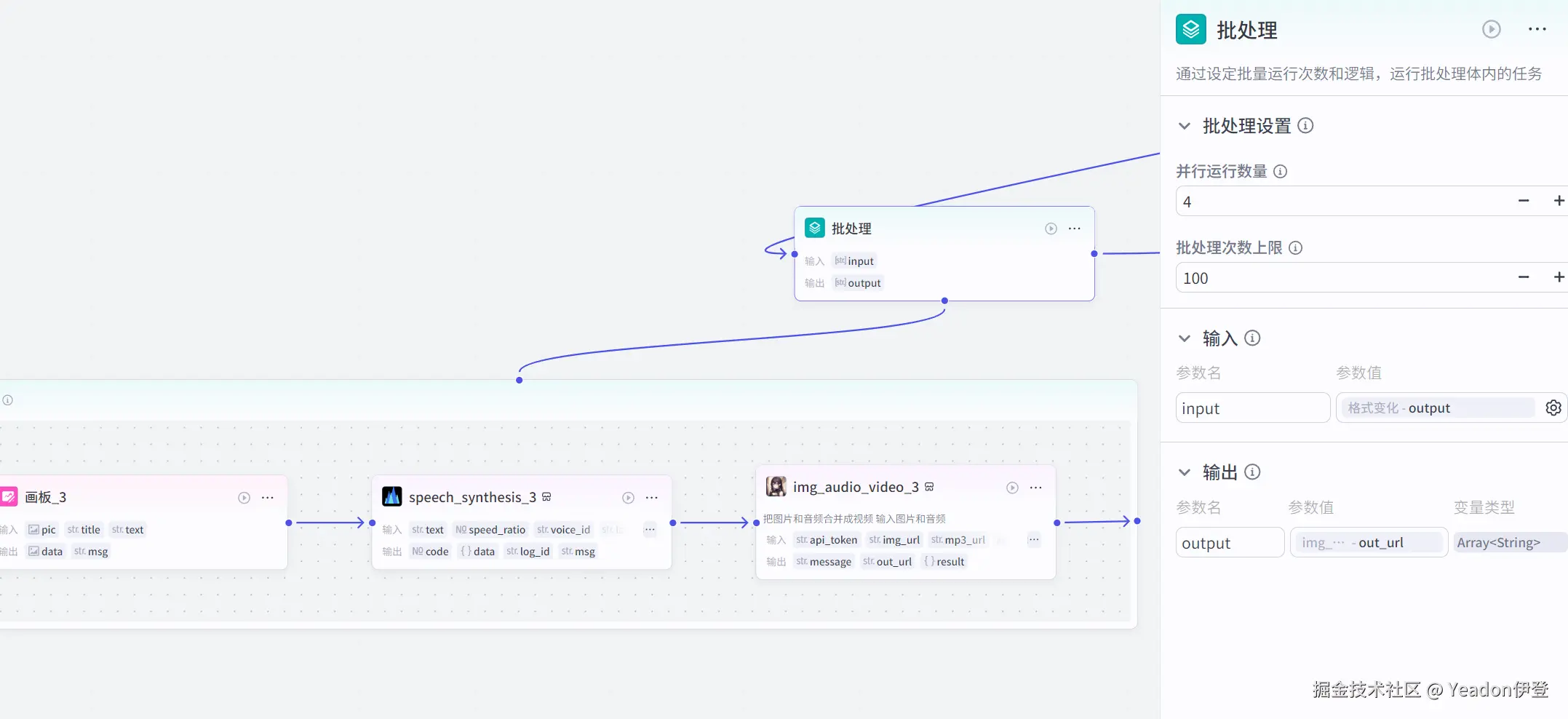由于上一步我们生成一句一句的口播内容,因此我们用批量化节点,做成一帧一帧的画面,用画板节点完成