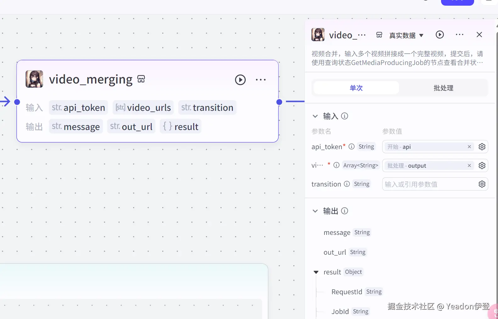 最后多段一句话口播图文视频出来后,将他们结合在一起,成为一整段视频,使用**视频融合节点**