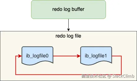 默认情况下,InnoDB 存储引擎有一个 Redo Log Group,该重做日志文件组由 2 个 Redo Log 文件组成,且每个 Redo Log File 的大小固定且一致,如下图