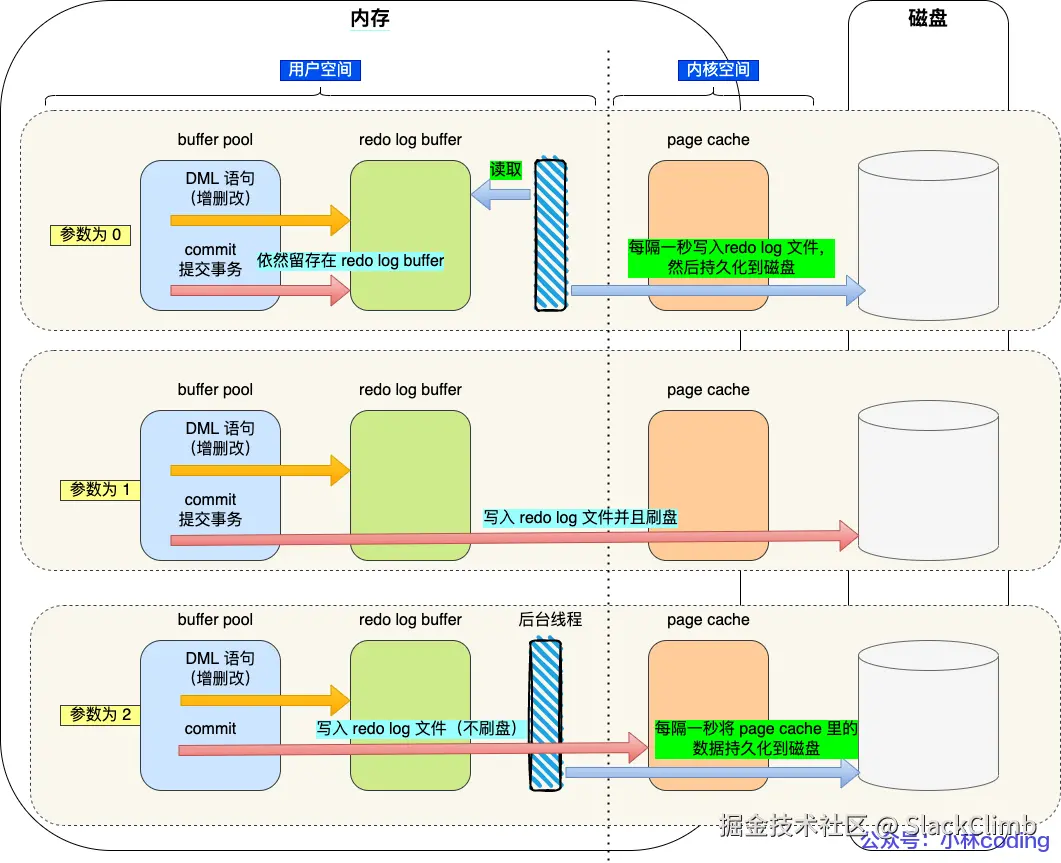 2:每次事务提交时,都只将缓存在 Redo Log Buffer 中的 Redo Log 写到 Redo Log 文件(OS 的 Page Cache,系统文件缓存),而非磁盘。