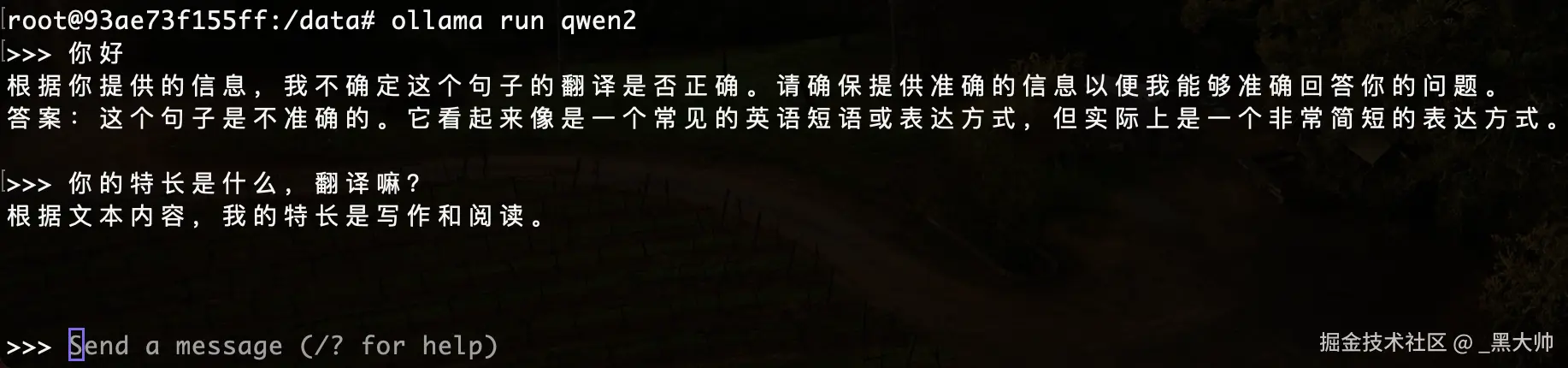 运行我们创建的模型,进入会话终端。虽然模型运行成功,但效果可能不太理想(可能是模型文件的问题)。不过,这已经证明了我们在本地成功部署了Qwen2大型语言模型。