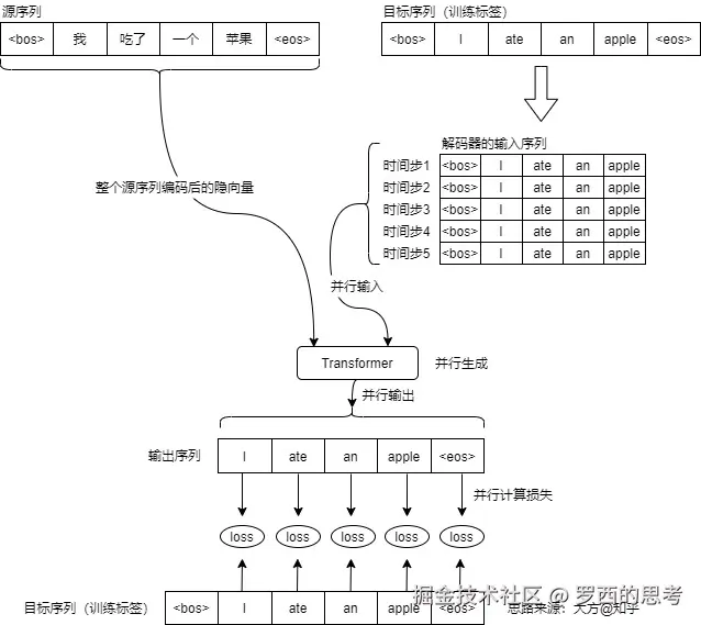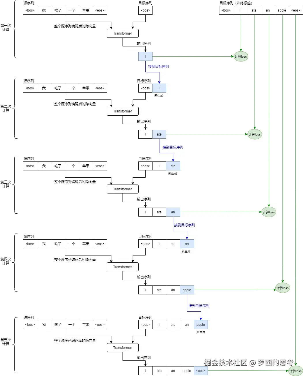 | 5 | 计算损失 | 损失函数将此输出序列与训练数据中的目标序列进行比较,计算损失 | 无 |
