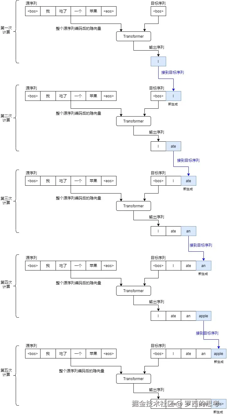 - 推理:每次输出一个新token。Decoder的并行化仅在训练阶段,在推理阶段,因为我们没有正确的目标语句,t时刻的输入必然依赖t-1时刻的输出,这时跟之前的seq2seq就没什么区别了。