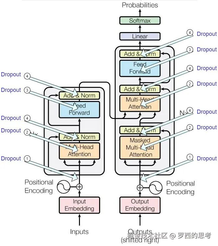 - "Add & Norm"之间也有dropout(对应图上序号4)。