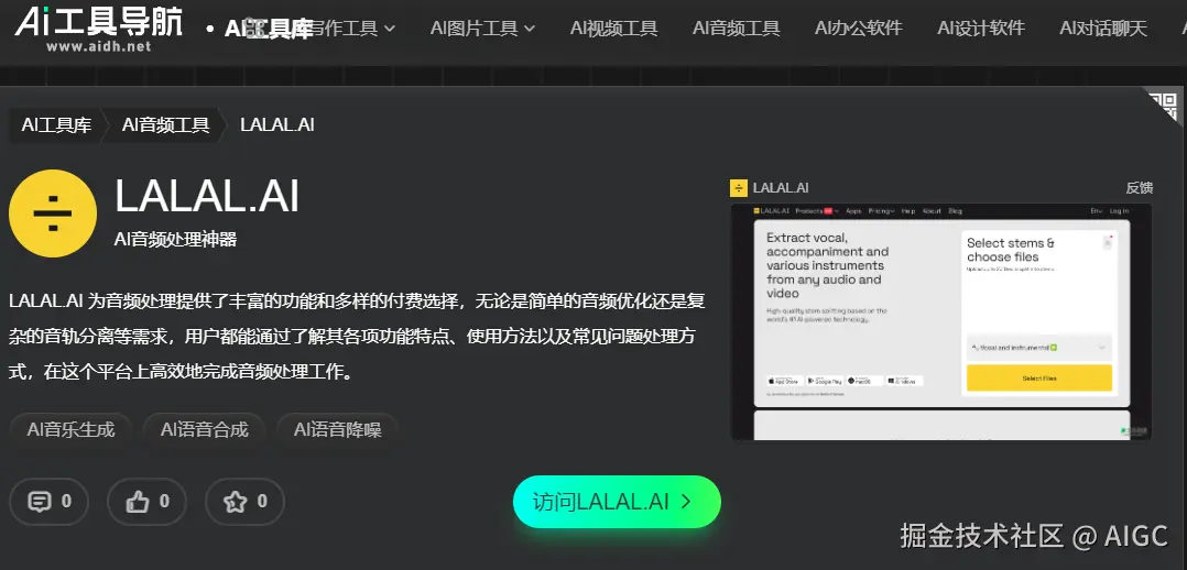 ——LALAL.AI,为我们解决音频噪音问题,带来全新的音频处理体验,无需到处寻找,我的小技巧就是通过AI工具导航即可找到它。