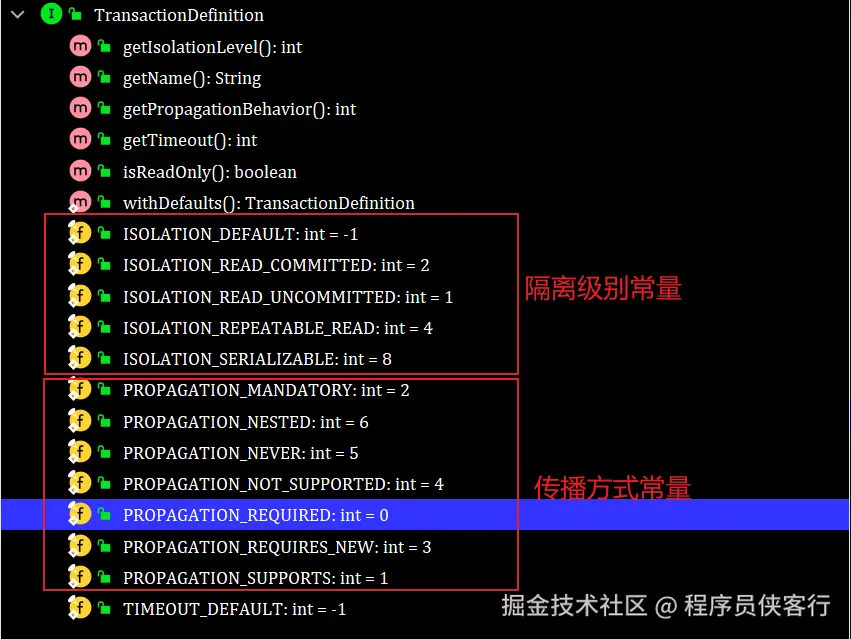 在子类DefaultTransactionDefinition中,可以看到默认值:PROPAGATION_REQUIRED、ISOLATION_DEFAULT、TIMEOUT_DEFAULT、非readOnly。