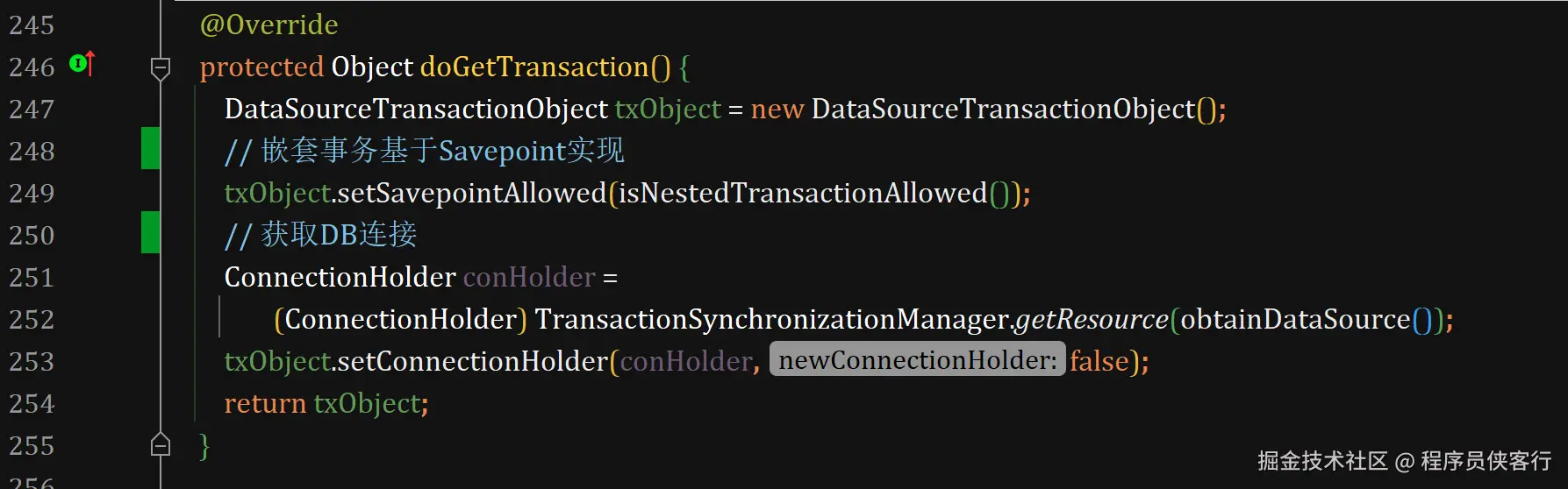- 如果DataSourceTransactionObject没有连接,则获取一个连接