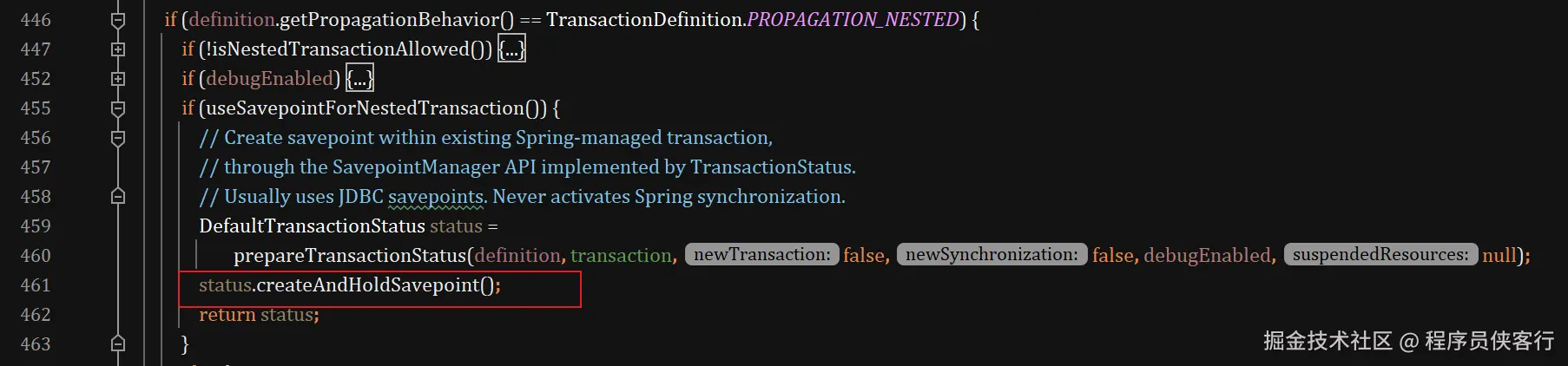 - 如果是PROPAGATION_NESTED,则先设置savepoints(可以回滚到此处),然后使用同一个连接继续执行。
