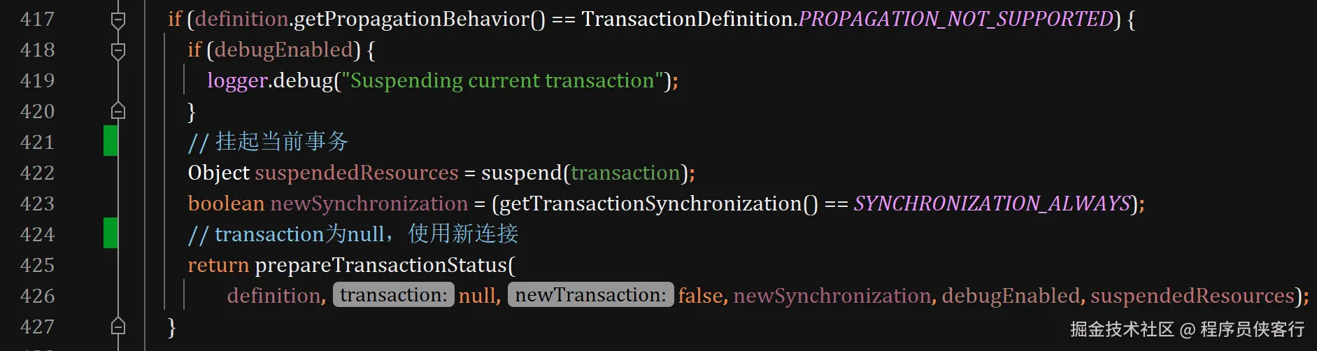 - 如果是PROPAGATION_NOT_SUPPORTED,则挂起当前事务,用一个新连接的非事务方式执行当前方法;