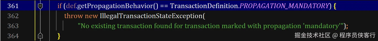 - 如果传播行为是PROPAGATION_MANDATORY,则抛异常