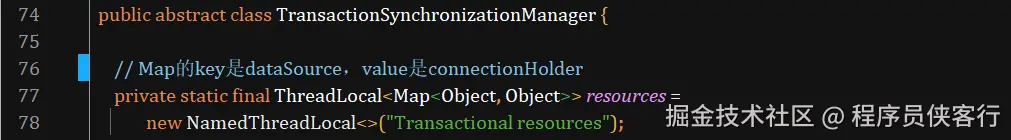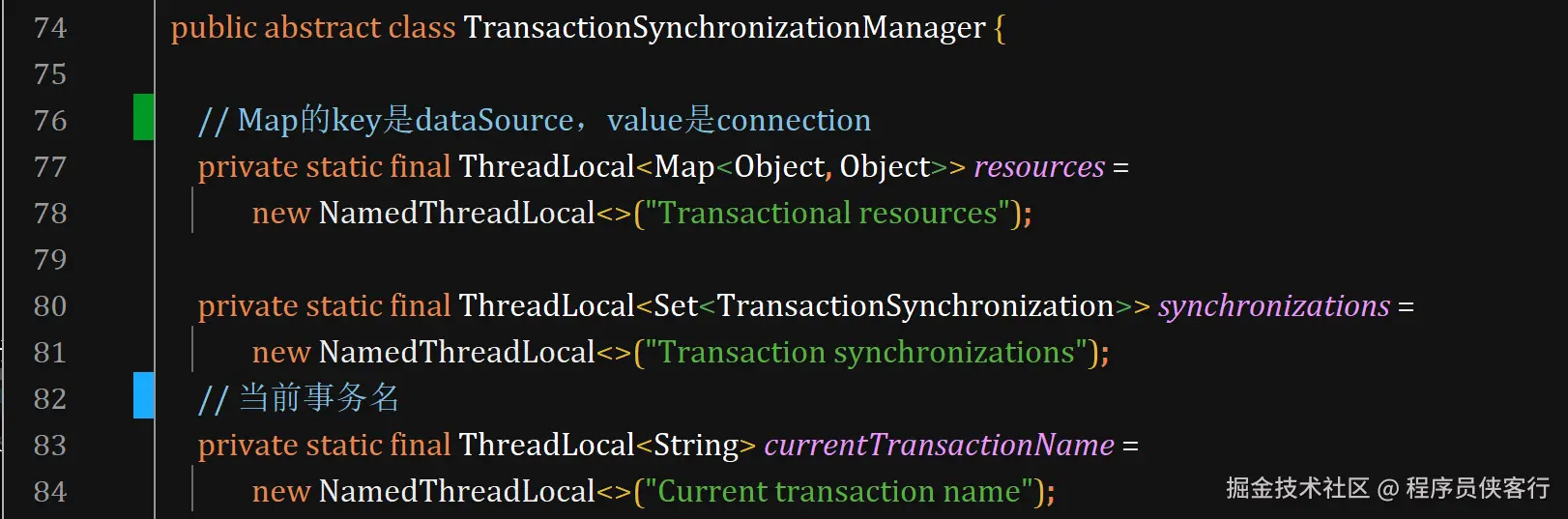 事务同步管理器,用于将事务相关信息与当前线程绑定,以支持各种事务传播行为。其中有多个ThreadLocal属性。