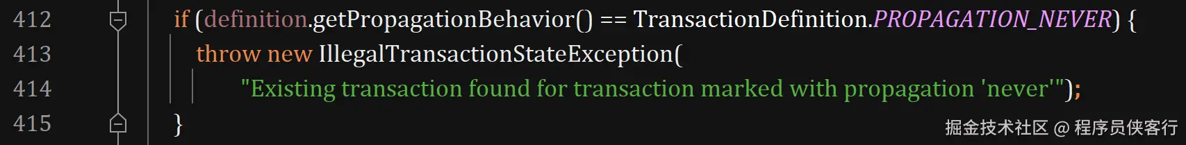 - 如果当前方法传播行为是PROPAGATION_NEVER,则抛异常