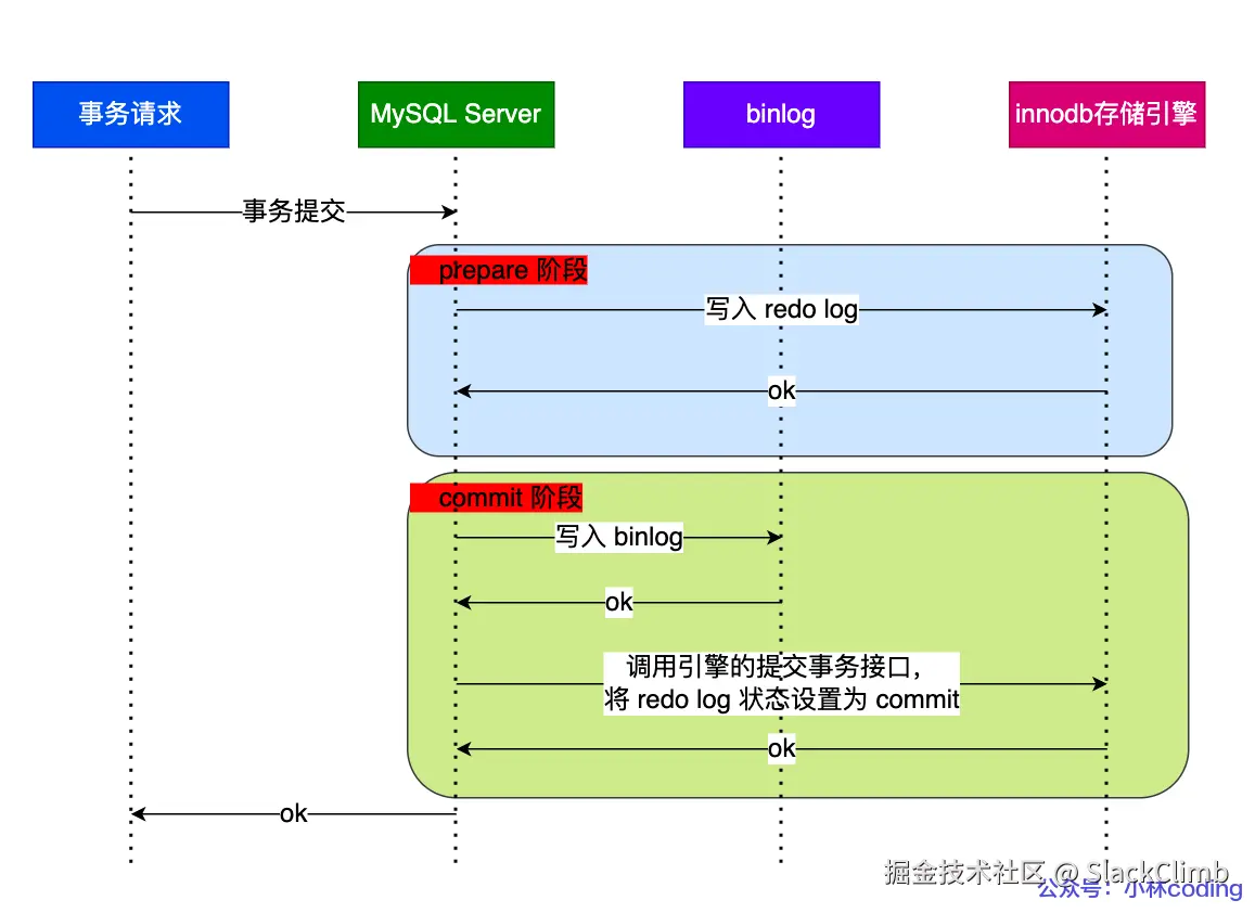 - 两阶段提交是以 binlog 写成功为事务提交成功的标识,因为 binlog 写成功了,就意味着能在binlog 中查找到与 redo log 相同的 XID。