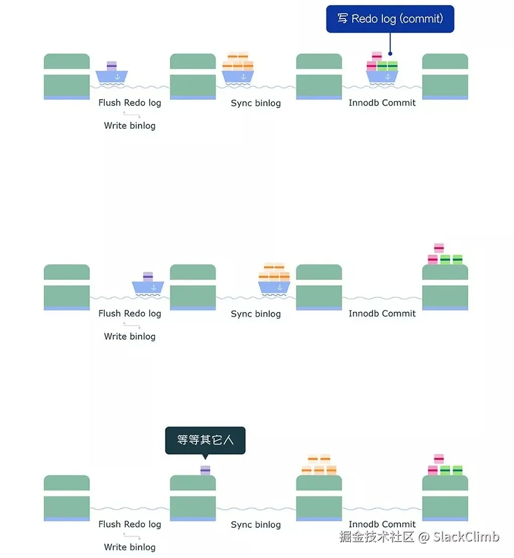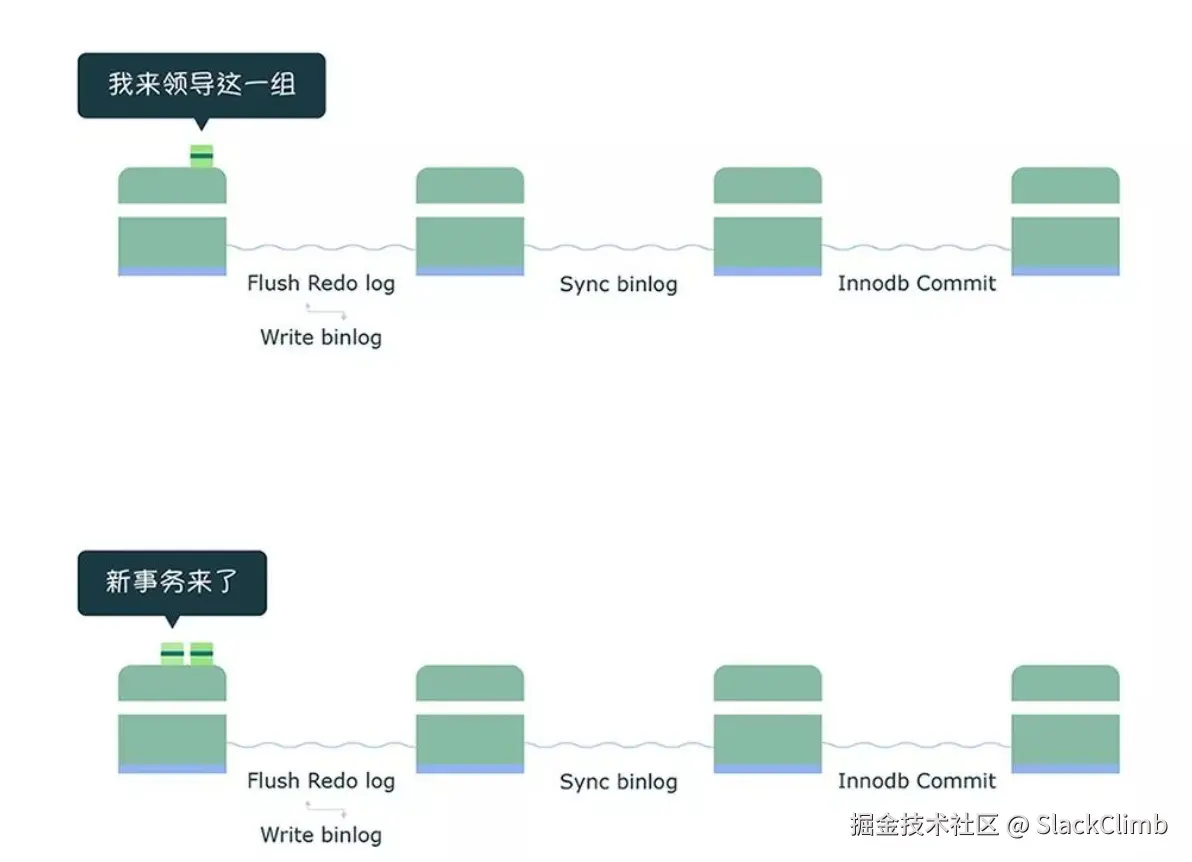 - 队列 leader: 组提交的各个阶段都有一个队列,每个阶段都有锁进行保护,因此保证了事务写入顺序,第一个进入队列的事务会成为 leader,leader 领导所在队列的所有事务,全权负责整队的操作,完成后,通知队内其他事务操作结束。