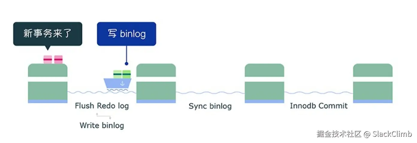 write+fsync,即一次将同组事务的 Redo Log 刷盘。 - 完成 prepare 阶段后,将绿色这一事务组执行过程中产生的 Binlog 写入 Binlog 文件(调用