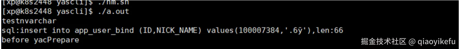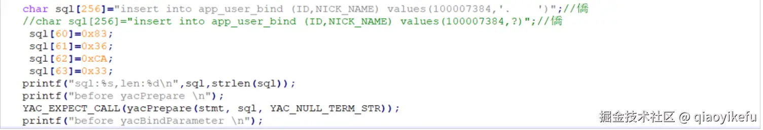 复现用例,这些字符既不是 gbk、也不是 utf 编码,正常写 insert sql 是写不出来的,所以使用 16 进制替换字符的方式,使用 c 驱动来复现。