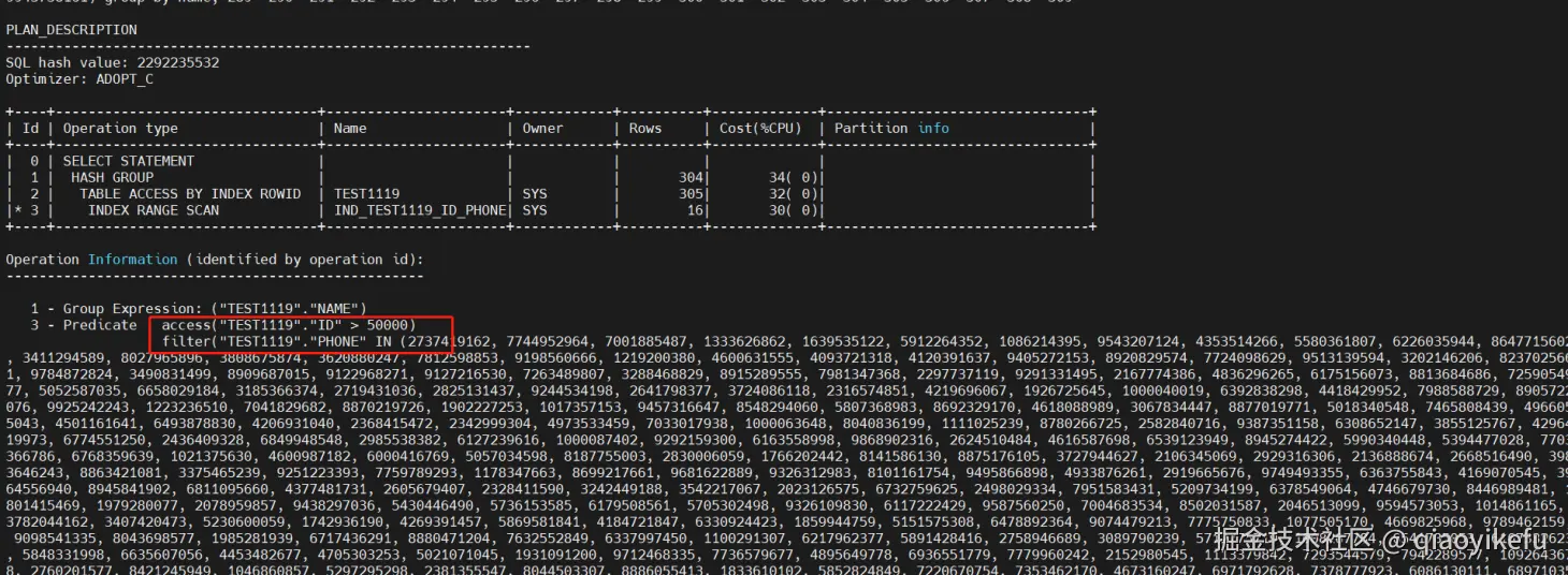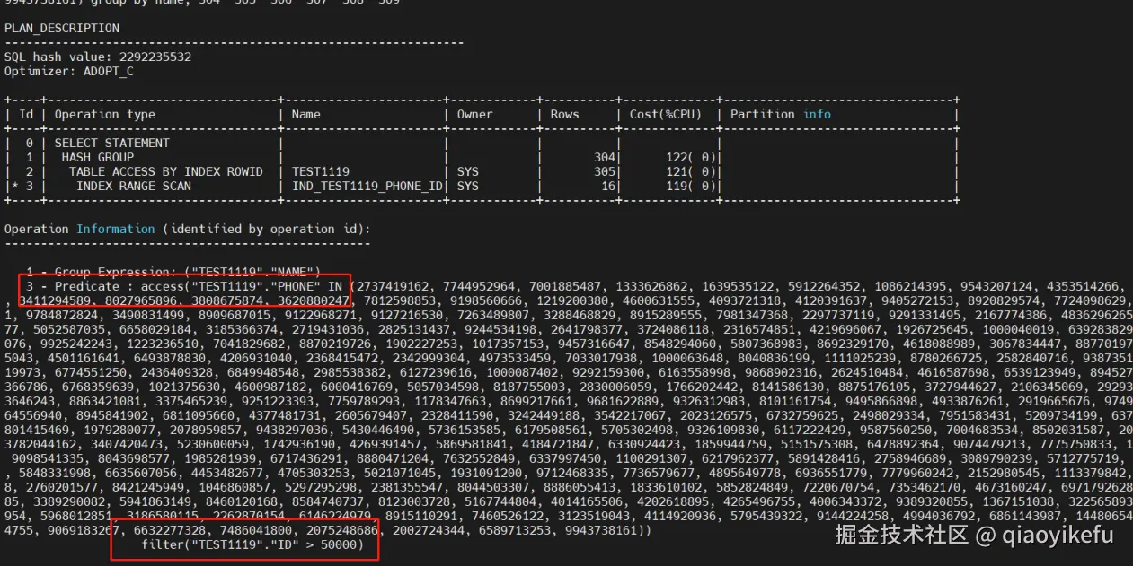 检查执行计划可知,计划中先 access ID>50000 的区域,再用 filter 去过滤 in 大量参数的场景,整体性能较差
