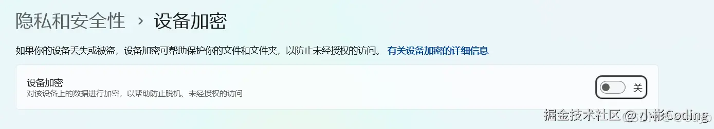 Win+I打开设置 → 隐私和安全性 → 设备加密- 点击"关闭"按钮(图4),需输入微软账户密码验证(已登录的不需要验证)
