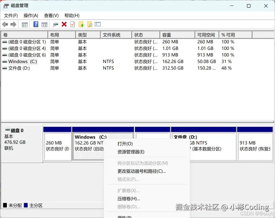 - 使用window的磁盘管理(仅相邻的空间能扩展,所以需要先拷贝D盘)