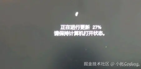 今天升级Windows 11至23H2版本时遭遇系统重启后卡在27%进度黑屏的异常现象。出现系统无响应、风扇高速运转等表现。分析了一下原因并尝试一些方案解决了, 记录一下。