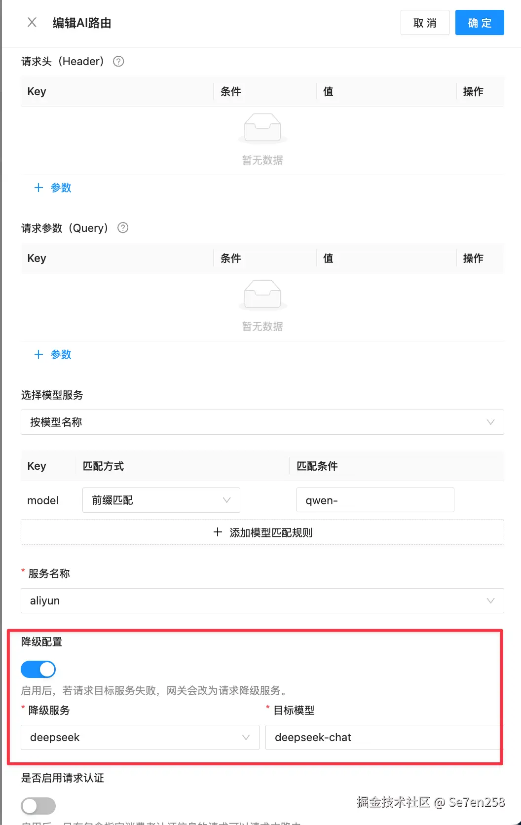 接下来,我们将以通义千问作为主 LLM 服务,DeepSeek 作为备 LLM 服务进行演示。在 AI 路由管理界面中,选择通义千问预设的 AI 路由(aliyun),并启用降级配置。在降级服务选项中选择 deepseek,同时将目标模型设置为 deepseek-chat。